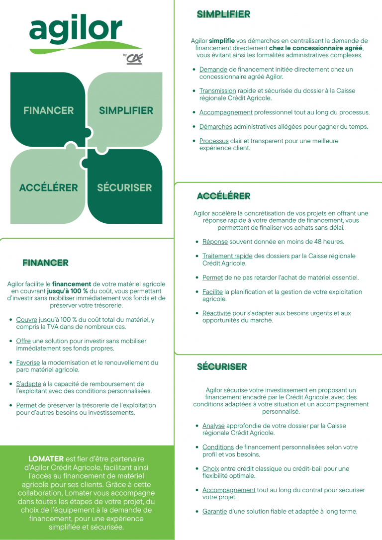 Lomater est fier d’être partenaire d’Agilor Crédit Agricole, facilitant ainsi l’accès à l’achat d’équipement agricole pour ses clients. Grâce à cette collaboration, Lomater vous accompagne dans toutes les étapes de votre projet, du choix de l’équipement à la demande de financement, pour une expérience simplifiée et sécurisée.